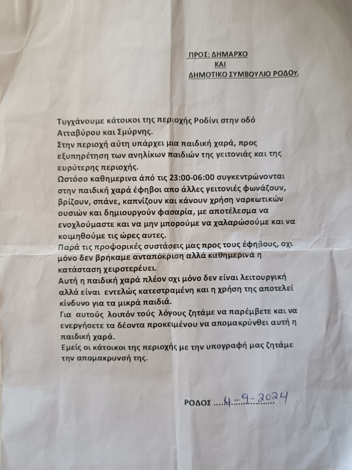 Τυγχάνουμε κάτοικοι της περιοχής Ροδίνι στις οδούς Ατταβύρου και Σμύρνης. Στην περιοχή αυτή, υπάρχει μια παιδική χαρά, προς εξυπηρέτηση των ανήλικων παιδιών της γειτονιάς και της ευρύτερης περιοχής. Ωστόσο, καθημερινά, από τις 11 το βράδυ έως τις 6 το πρωί, συγκεντρώνονται στο σημείο αυτό έφηβοι από άλλες γειτονιές, φωνάζουν, βρίζουν, σπάνε και σε ορισμένες περιπτώσεις κάνουν και χρήση ναρκωτικών ουσιών, δημιουργώντας φασαρίες, με αποτέλεσμα να μην μπορούμε να χαλαρώσουμε τις ώρες αυτές.