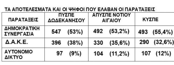 Η ΔΗΜΟΚΡΑΤΙΚΗ ΣΥΝΕΡΓΑΣΙΑ αναδείχτηκε πρώτη δύναμη στα Δωδεκάνησα, στο ΠΥΣΠΕ Δωδεκανήσου, στο ΑΠΥΣΠΕ Νοτίου Αιγαίου και στο ΚΥΣΠΕ.
