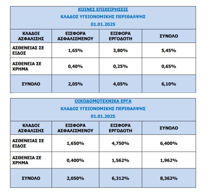 Από την 1η.1.2025, η ασφαλιστική εισφορά υπέρ υγειονομικής περίθαλψης των μισθωτών και των λοιπών κατηγοριών που υπάγονται στον ΕΟΠΥΥ, των οποίων οι ασφαλιστικές εισφορές κλάδου σύνταξης υπολογίζονται κατά τα προβλεπόμενα του νόμου 5162/2024, ορίζεται σε ποσοστό 6,10% επί των πάσης φύσεως αποδοχών και κατανέμεται κατά ποσοστό 5,45% για παροχές σε είδος, εκ του οποίου 1,65% βαρύνει τον ασφαλισμένο και 3,80% τον εργοδότη, και ποσοστό 0,65% για παροχές σε χρήμα εκ του οποίου 0,40% βαρύνει τον ασφαλισμένο και 0,25% βαρύνει τον εργοδότη.