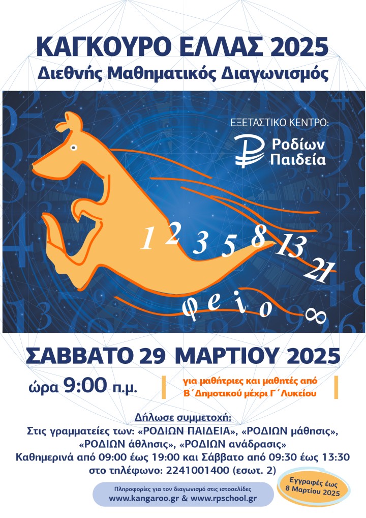 Το Σάββατο, 29 Μαρτίου 2025 και ώρα 09:00 το πρωί θα διεξαχθεί ο μαθηματικός διαγωνισμός «Καγκουρό» στα Εκπαιδευτήρια «ΡΟΔΙΩΝ ΠΑΙΔΕΙΑ».