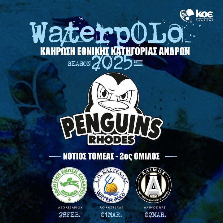 Απέναντι στον ΑΟ Καστέλλας, την ΑΕ Χαϊδαρίου και τον Άλιμο θα παίξει η ανδρική ομάδα πόλο των «Πιγκουίνων», εκπροσωπώντας ουσιαστικά τα Δωδεκάνησα στη νέα Εθνική κατηγορία, όπως έχει διαμορφωθεί από την ΚΟΕ.