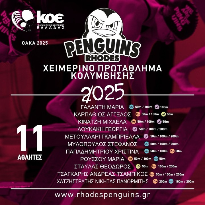 Αντιμέτωποι με αθλητές από όλη τη Νότια Ελλάδα, οι Πιγκουίνοι Ρόδου θα αγωνιστούν σε ένα από τα δυνατότερα πρωταθλήματα της χρονιάς, με τη συμμετοχή να είναι εντυπωσιακή και τις απαιτήσεις ακόμα μεγαλύτερες. Οι αγώνες θα διεξαχθούν σε πέντε αγωνιστικές ενότητες, δίνοντας στους αθλητές μας την ευκαιρία να δοκιμάσουν τις δυνατότητές τους, να κυνηγήσουν ατομικά ρεκόρ και να αποκτήσουν πολύτιμες εμπειρίες.