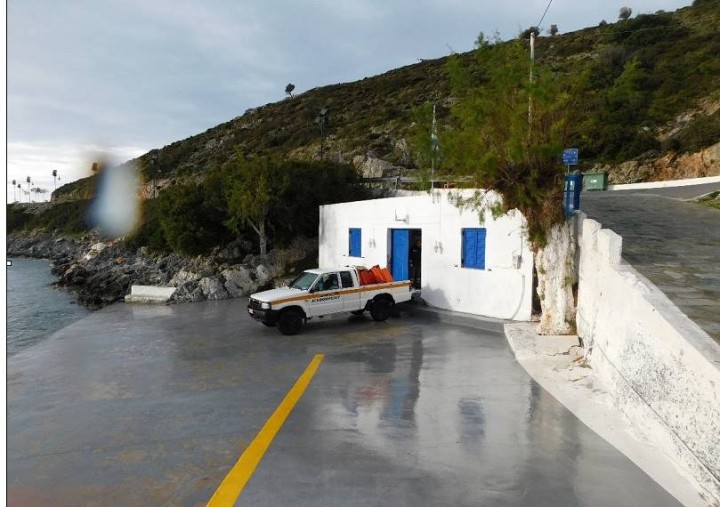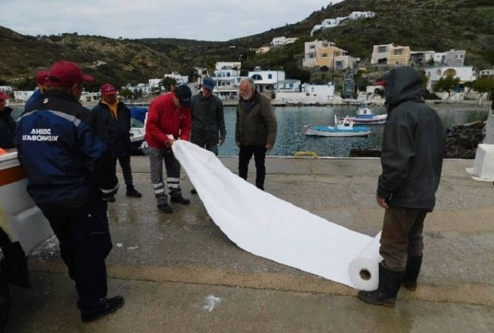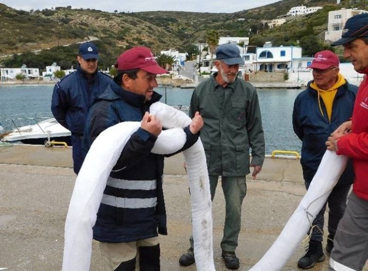 Εν συνεχεία, έγινε επίδειξη χρήσης των απορροφητικών και προσκολλητικών υλικών, καθώς και των ειδικών ταχυσυνδέσμων των πλωτών φραγμάτων, τα οποία είχε μεταφέρει με ειδικών διαστάσεων μπαγκαζιέρα η Μαρίνα «EVROS SA», με τη βοήθεια οχήματος 4 Χ 4 του Λιμεναρχείου Λέρου.