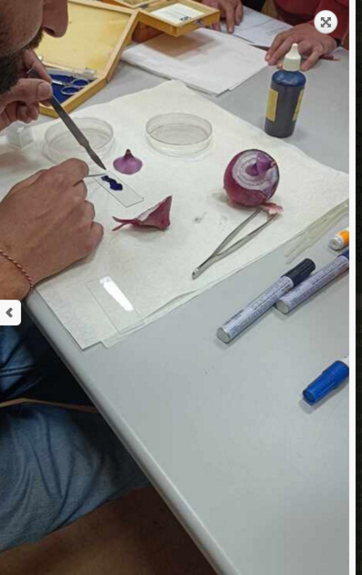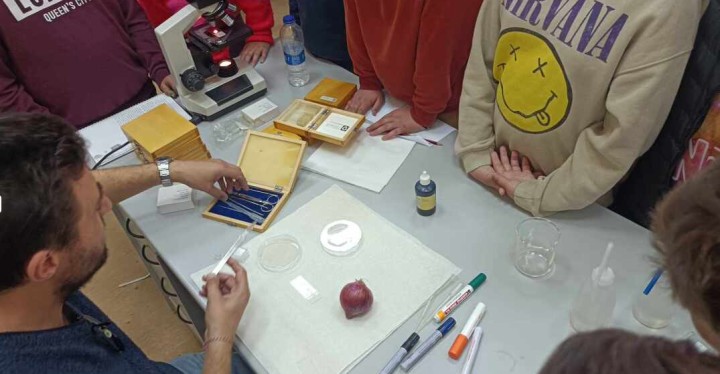 Τέλος, οι μαθητές παρακολούθησαν την εκτέλεση ενός πειράματος σχετικά με την παρατήρηση πυρήνων σε κύτταρα από τον βολβό του κρεμμυδιού (φυτικά κύτταρα).