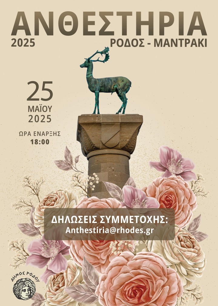 "Ο Δήμος Ρόδου σας προσκαλεί να συμμετάσχετε στα «ΑΝΘΕΣΤΗΡΙΑ 2025», στη μεγάλη γιορτή της Άνοιξης με λουλούδια, χρώματα κι αρώματα που θα πραγματοποιηθεί την Κυριακή 25 Μαΐου και ώρα 18.00 στο Μαντράκι!