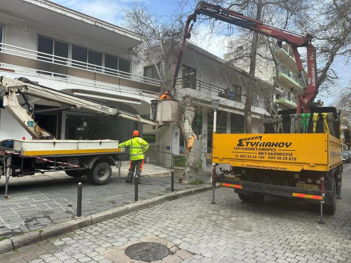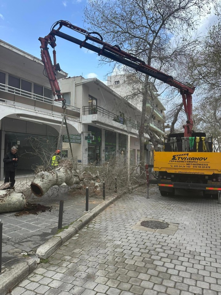 Για την απομάκρυνσή του, ο αντιδήμαρχος της υπηρεσίας Πρασίνου κος Μητσού κάλεσε τον σύνδεσμο ιδιοκτητών φορτηγών δημοσίας χρήσεως, στελέχη του οποίου απομάκρυναν τους τεμαχισμένους κορμούς από το σημείο.