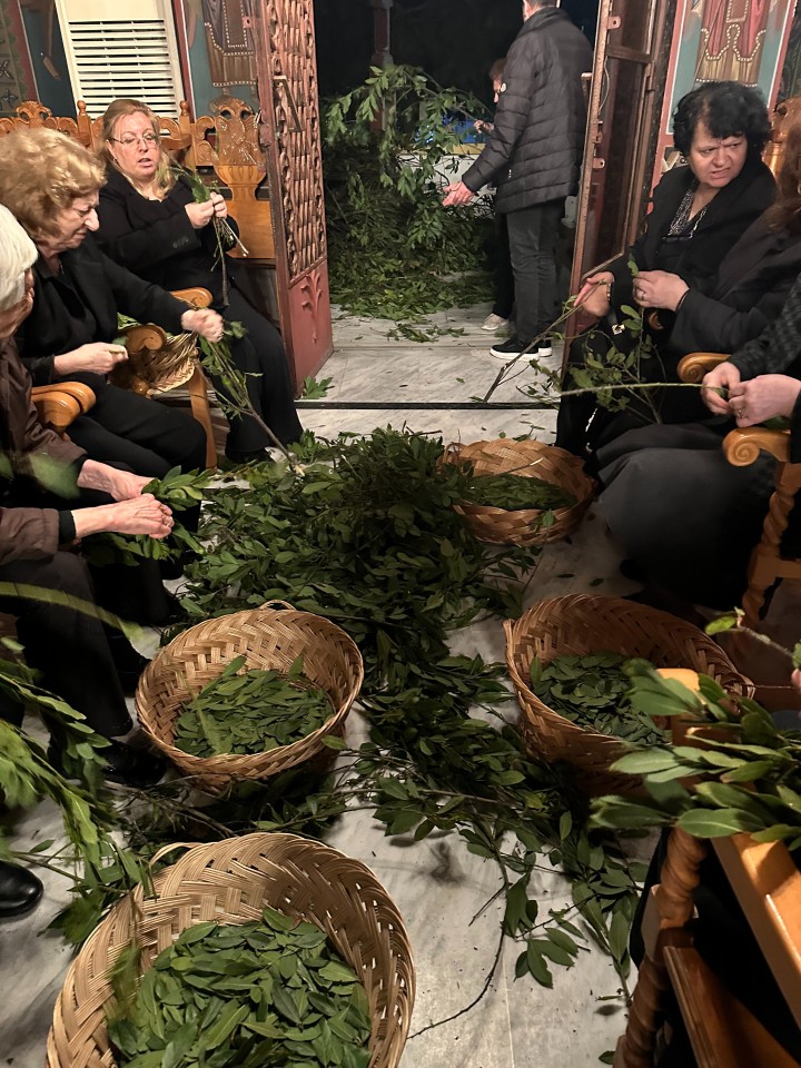 Σύμφωνα με τη θρησκεία και τις παραδόσεις μας, στην πρωινή Λειτουργία του Μ. Σαββάτου έχουμε το χτύπημα των θρονιών με το οποίο γίνεται γνωστή η Ανάσταση του Κυρίου, ενώ την ίδια ώρα ο ιερέας ραίνει με δαφνόφυλλα. Γυναίκες λοιπόν της ενορίας της Αναλήψεως χθες βράδυ προετοίμασαν τα φύλλα δάφνης σε κλίμα κατάνυξης και με προσμονή της Μεγάλης Ώρας της Αναστάσεως!