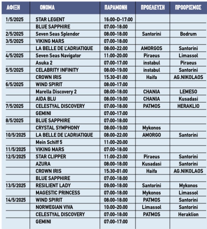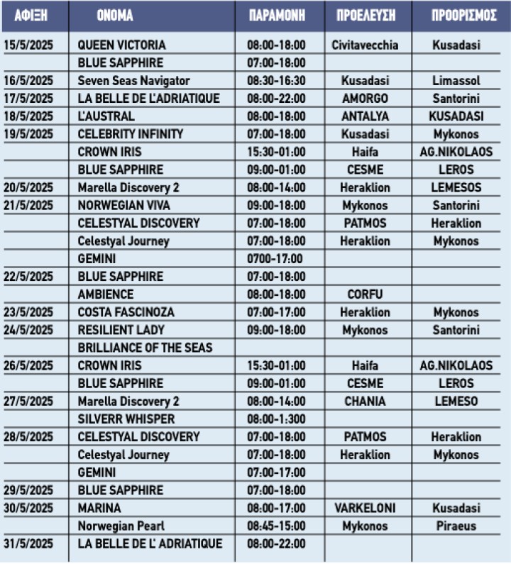 Εκείνες τις μέρες αναμένονται τέσσερα κρουαζιερόπλοια, ενώ μεγάλη κίνηση θα υπάρχει επίσης στις 6, 19 και 28 Μαΐου, καθώς θα υπάρχουν τρία κρουαζιερόπλοια στο λιμάνι.
