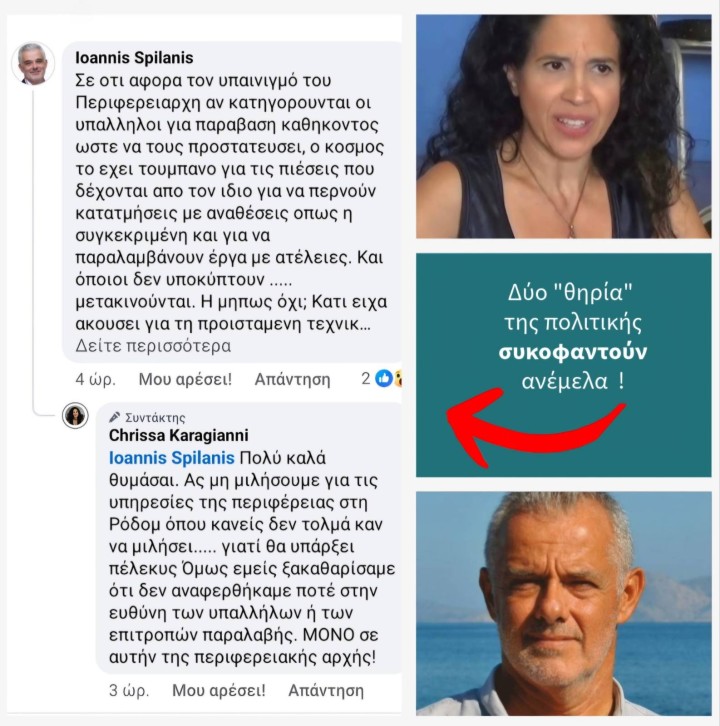 Απάντηση στον πρόσφατο διάλογο που είδε το φως της δημοσιότητας στα μέσα κοινωνικής δικτύωσης εξέδωσε το γραφείο Τύπου της περιφέρειας Νοτίου Αιγαίου και στον οποίο, όπως αναφέρει «πρωταγωνιστούν δύο πρόσωπα, η Χρύσα Καραγιάννη και ο Ιωάννης Σπιλάνης, που νομίζουν ότι υπηρετούν την πολιτική». Ειδικότερα, στην ανακοίνωση-απάντηση επισημαίνονται τα εξής: