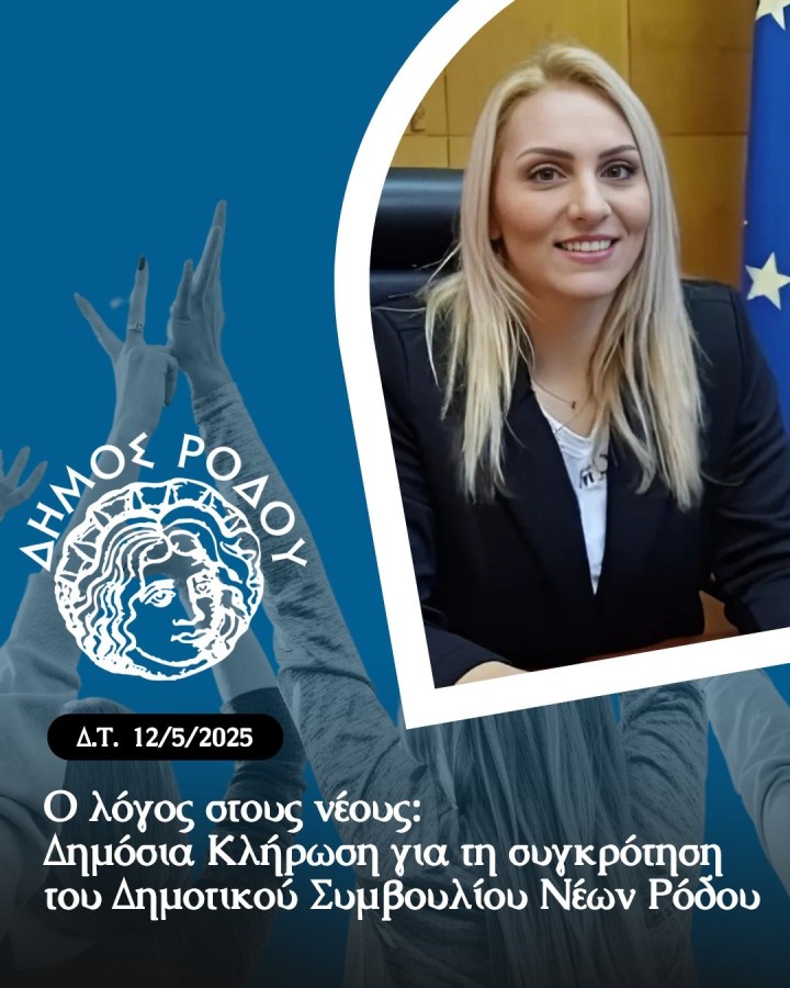 Ο Δήμος Ρόδου κάνει ένα σημαντικό βήμα για να ενισχύσει τη συμμετοχή των νέων ανθρώπων στα κοινά. Την Τετάρτη 21 Μαΐου 2025 στις 17:00, στην αίθουσα συνεδριάσεων του Δημοτικού Συμβουλίου, θα γίνει δημόσια κλήρωση για την επιλογή των 25 μελών και των αναπληρωτών του Δημοτικού Συμβουλίου Νέων.