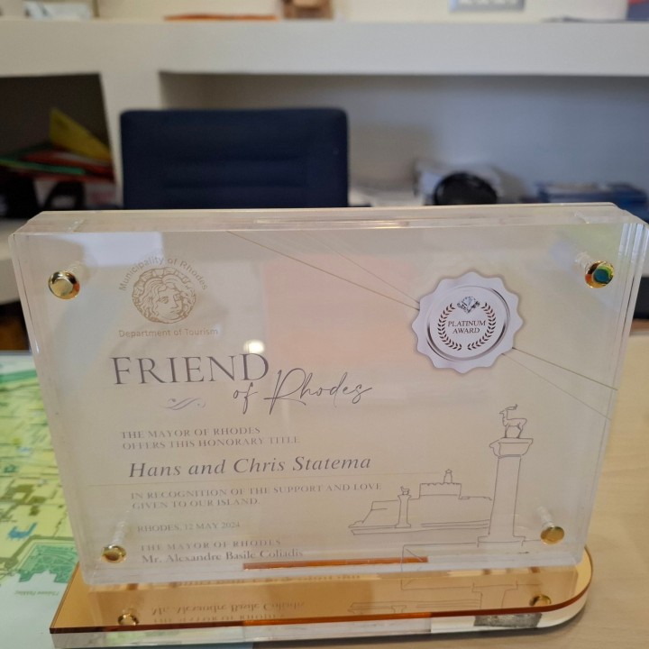 Στη συνέχεια, τα στελέχη της Διεύθυνσης Τουρισμού απένειμαν πλατινένια πλακέτα, την ανώτατη τιμητική διάκριση, σε ένα ζευγάρι Ολλανδών τουριστών τους Hans & Chris Statema, που επισκέπτεται τη Ρόδο συνεχόμενα, επί 50 και πλέον έτη, περισσότερες από 100 φορές, τιμώντας τους ως πρεσβευτές πλέον της Ρόδου στην πατρίδα τους και όχι μόνον.