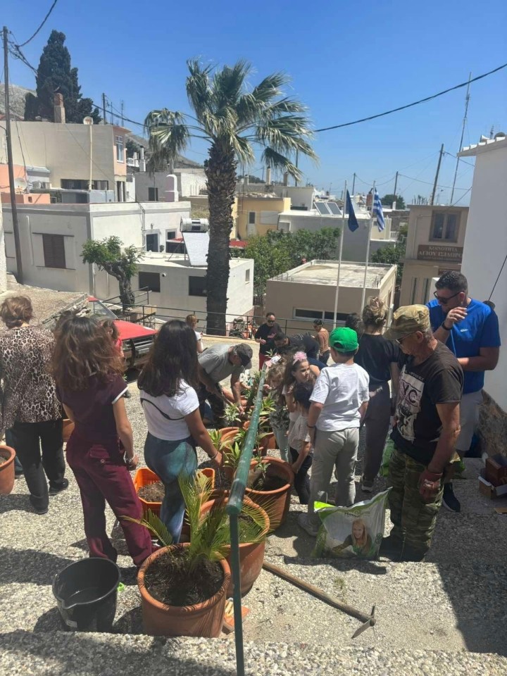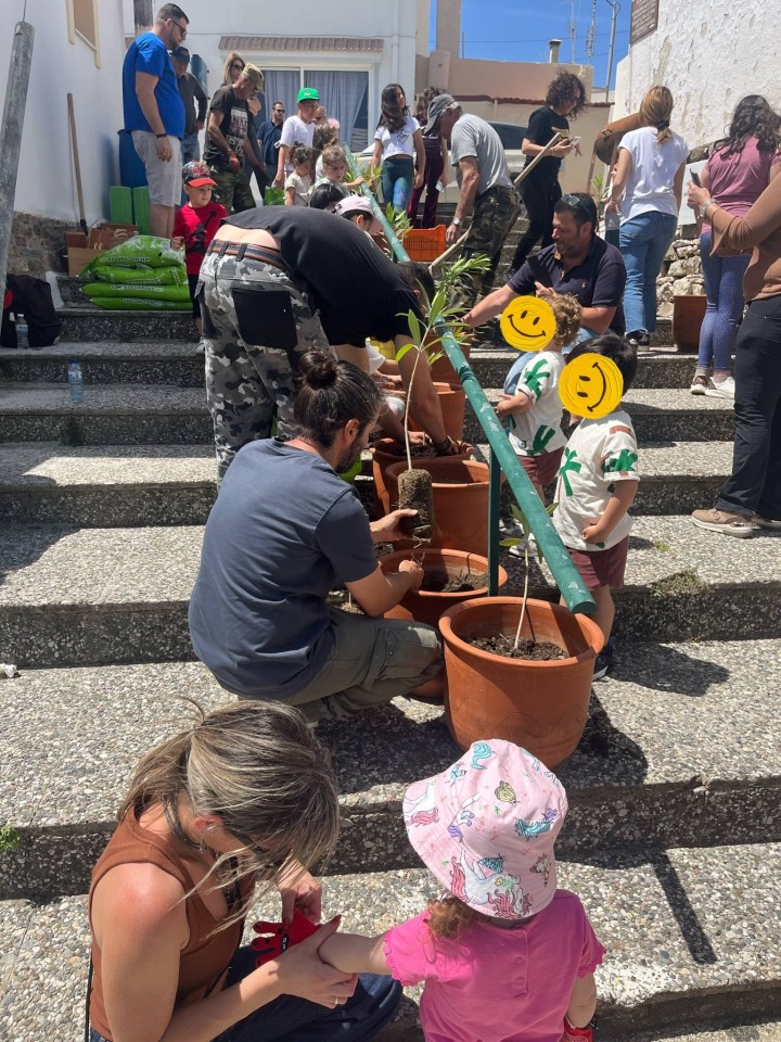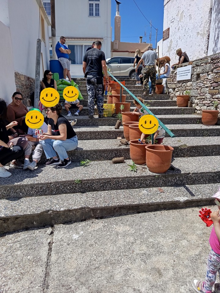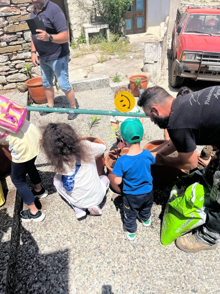 Χωρίστηκαν σε ομάδες και άρχισαν να φυτεύουν τις πήλινες γλάστρες στις δύο κεντρικές πλατείες του χωριού εύκολα και γρήγορα καθώς το χώμα ήταν ήδη έτοιμο.