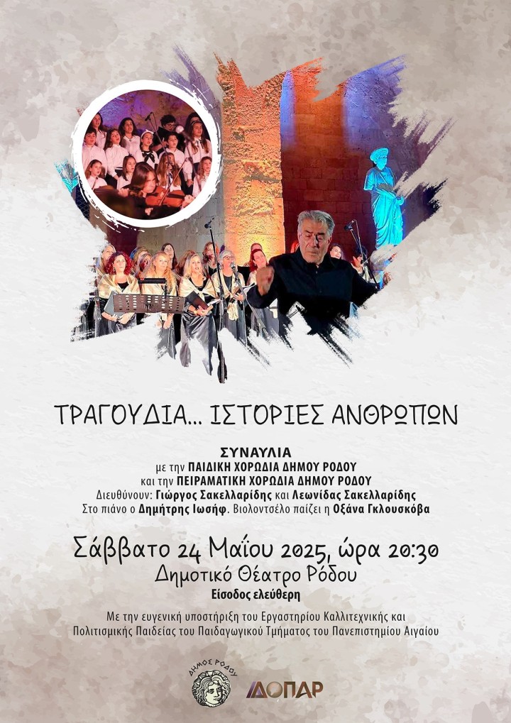 Η Διεύθυνση ΔΟΠΑΡ του δήμου Ρόδου διοργανώνει συναυλία με τίτλο: «Τραγούδια… Ιστορίες Ανθρώπων!» Η συναυλία θα πραγματοποιηθεί το Σάββατο 24 Μαΐου 2025, στις 20:30, στο Δημοτικό Θέατρο Ρόδου, με ελεύθερη είσοδο.