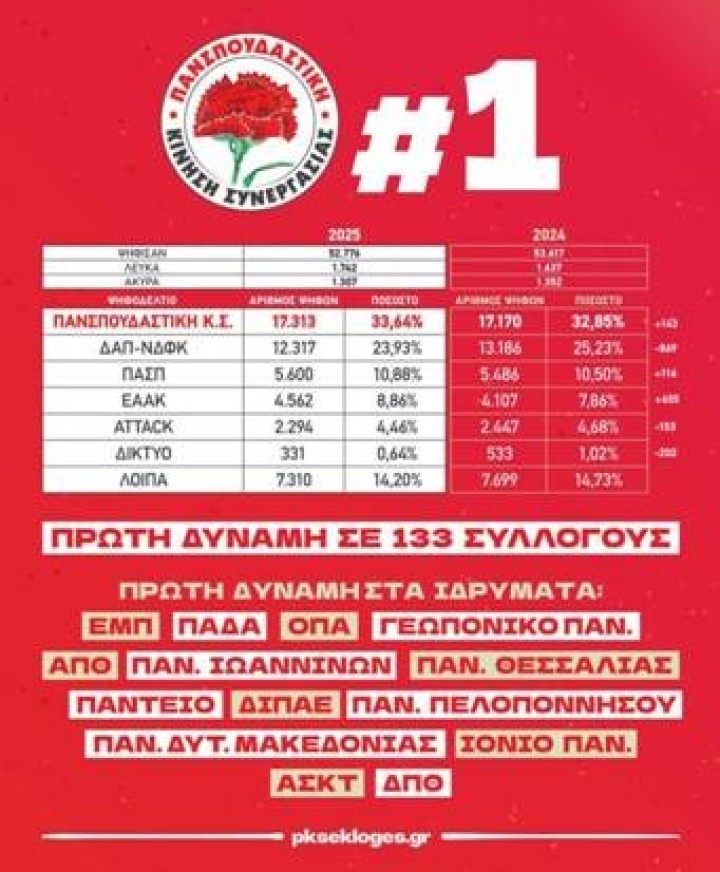 "Χαιρετίζουμε τους χιλιάδες φοιτητές και φοιτήτριες που συμμετείχαν στις φοιτητικές εκλογές, αναδεικνύοντας σε πρώτη δύναμη την Πανσπουδαστική Κ.Σ. για 4η συνεχόμενη χρονιά! Όσους και όσες δώσαμε μαζί τη μάχηγια να γίνουμεπερισσότεροι οι φοιτητές που «στείλαμε» μήνυμα απόρριψης της πολιτικής που δημιουργεί διαρκώς νέα εγκλήματα για τις σπουδές και τιςζωές μας!