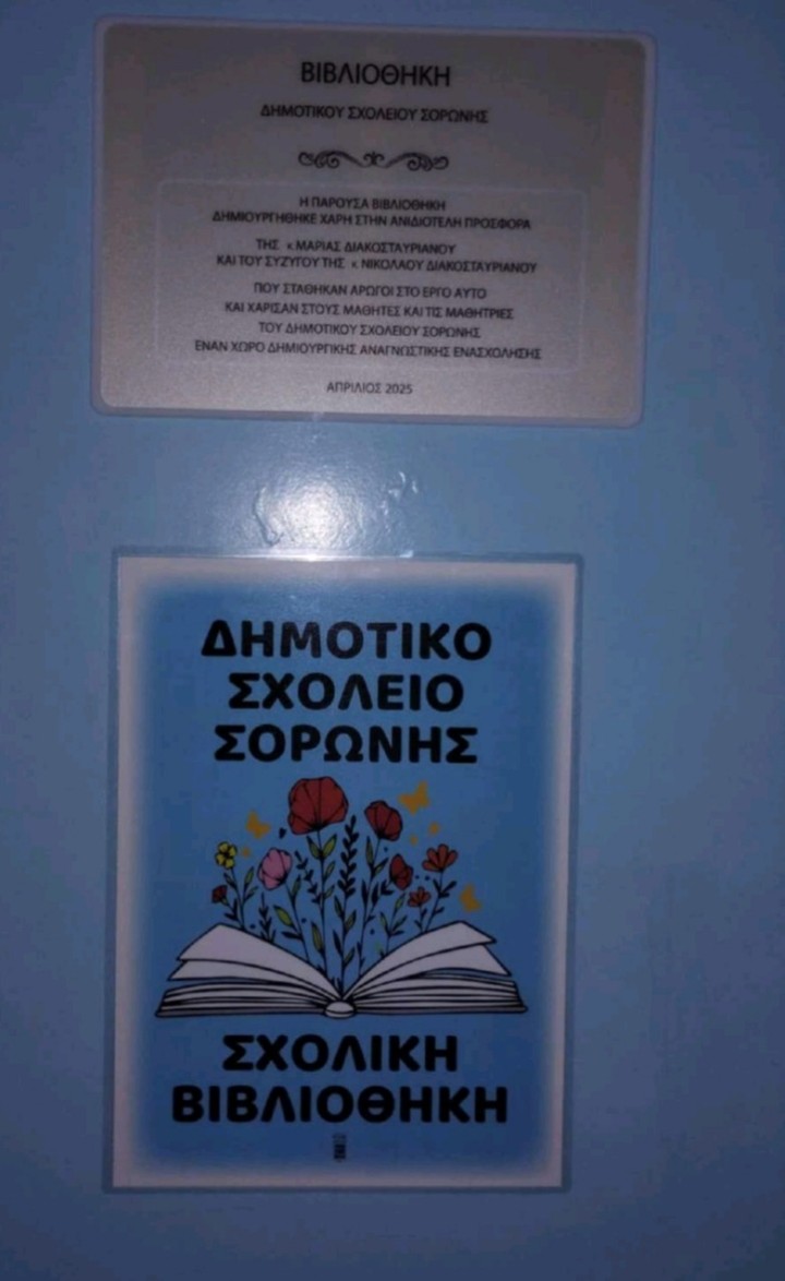 Την Τετάρτη, 28 Μαΐου 2025 στο Δημοτικό Σχολείο Σορωνής πραγματοποιήθηκαν τα εγκαίνια της Σχολικής Βιβλιοθήκης, αφού προηγήθηκαν δράσεις φιλαναγνωσίας παρουσία του συγγραφέα, δημοσιογράφου και συνεργάτη του Μουσείου Σχολικής Ζωής και Εκπαίδευσης κ. Κώστα Στοφόρου.