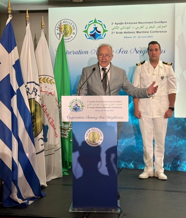 Στην εναρκτήρια ομιλία του στο Συνέδριο, παρουσία της Υφυπουργού Εξωτερικών κας Αλεξάνδρας Παπαδοπούλου και Πρέσβεων πολλών Αραβικών Χωρών, ο Υφυπουργός Ναυτιλίας και Νησιωτικής Πολιτικής, τοποθετήθηκε για τις παγκόσμιες εξελίξεις στον Ναυτιλιακό Κλάδο και ανέπτυξε τις θέσεις της Ελληνικής Κυβέρνησης, για τις δυνατότητες συνεργασίας, επενδύσεων και εμπορικών συναλλαγών, με τις Αραβικές Χώρες στην Ναυτιλία.