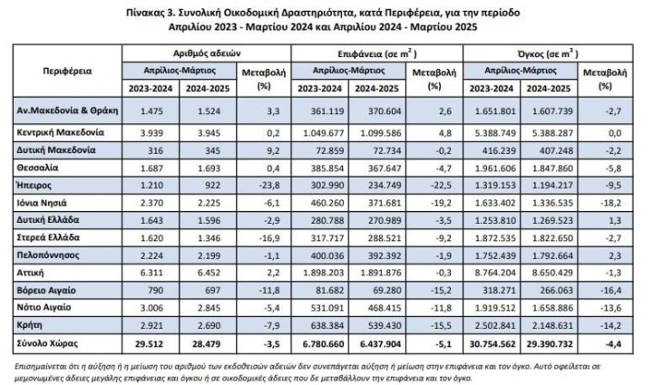 Το τρίμηνο Ιανουαρίου – Μαρτίου 2025, η Συνολική Οικοδομική Δραστηριότητα εμφανίζει, στο σύνολο της Χώρας, μείωση κατά 29,1% στον αριθμό των οικοδομικών αδειών, μείωση κατά 43,2% στην επιφάνεια και μείωση κατά 33,0% στον όγκο, σε σχέση με το αντίστοιχο τρίμηνο του έτους 2024. Κατά την ίδια περίοδο Ιανουαρίου – Μαρτίου 2025, η Ιδιωτική Οικοδομική Δραστηριότητα, εμφανίζει στο σύνολο της Χώρας, μείωση κατά 29,2% στον αριθμό των οικοδομικών αδειών, μείωση κατά 43,5% στην επιφάνεια και μείωση κατά 33,3% στον όγκο, σε σχέση με την περίοδο Ιανουαρίου – Μαρτίου 2024.