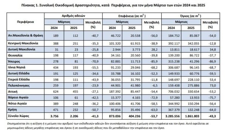 Αυτό αντιστοιχεί σε μείωση κατά 41,3% στον αριθμό των οικοδομικών αδειών, μείωση κατά 53,7% στην επιφάνεια και κατά 43,3% στον όγκο, σε σχέση με τον αντίστοιχο μήνα του 2024.