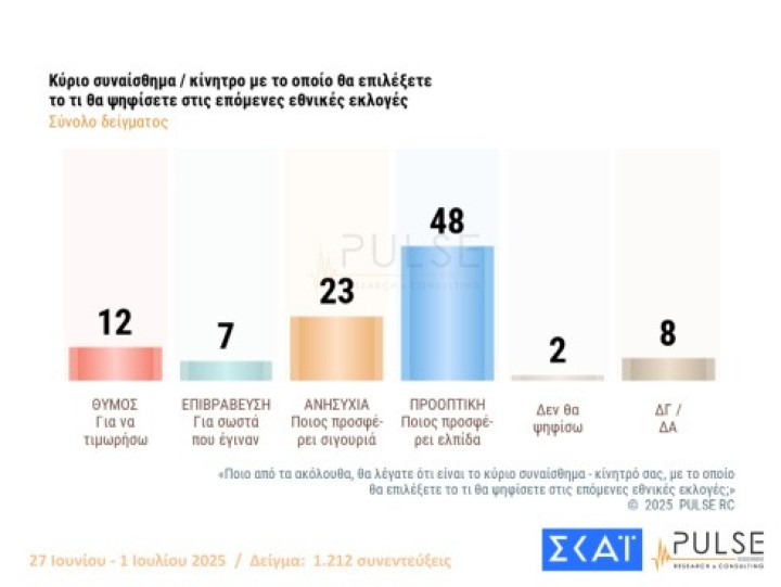Αντίθετα, πέφτει στην τέταρτη θέση στην ομάδα των ψηφοφόρων που λένε ότι θα ψηφίσουν με βάση του ποιος τους δίνει ελπίδα - που είναι το 48% του συνόλου. Στο πεδίο αυτό κυριαρχεί η ΝΔ , όπως και σε εκείνους που ψηφίζουν αναζητώντας σιγουριά, αλλά και σε όσους προτίθενται να δώσουν ψήφο επιβράβευσης.