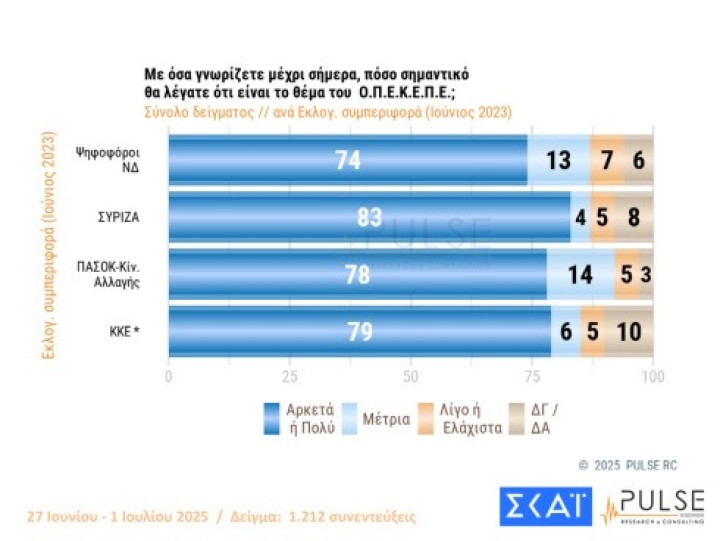 Η δημοσκόπηση δείχνει ότι το εκλογικό σώμα μόνον ανεπαίσθητα επηρεάζεται προς το παρόν από την υπόθεση του ΟΠΕΚΕΠΕ: Όλα τα κόμματα - πλην της Πλεύσης που χάνει μιάμιση μονάδα και του ΣΥΡΙΖΑ που κερδίζει μία - καταγράφουν στην πρόθεση ψήφου τα ίδια ποσοστά σε σχέση με την προηγούμενη μέτρηση της εταιρείας., ενώ εμφανίζεται και οριακή μείωση των αναποφάσιστων.