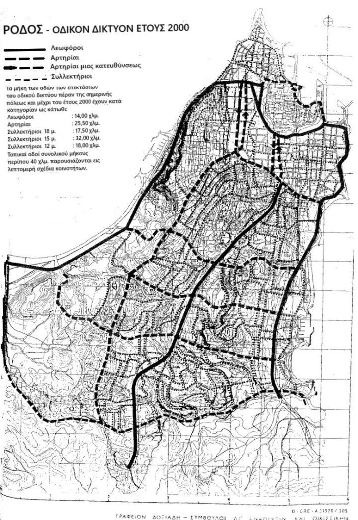 Θα ήθελα παρεμπιπτόντως να αναφερθώ και σε μια άλλη πολύπαθη Λεωφόρο, αυτήν που οδηγεί στην Ιαλυσό. Το Γραφείο Δοξιάδη το 1970 αναφέρει: «Έχει εκπονηθεί μελέτη για τη διαμόρφωση της οδού λεωφόρος Τριαντών σε αρτηρία διπλού κλάδου, δύο λωρίδων κυκλοφορίας σε κάθε κατεύθυνση μα διαχωριστική νησίδα 4,00 μέτρων» (σελίδα 403 του 2ου τόμου).
