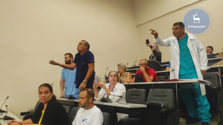 Ακολούθησαν ένταση και φωνασκίες καθώς υπουργός (σ.σ. ο οποίος ήταν πλαισιωμένος από τον ΔΥΠΕάρχη, Χρήστο Ροϊλό, και τον διοικητή του Νοσηλευτικού μας Ιδρύματος, Μιχάλη Σοκορέλο) και εκπρόσωποι των γιατρών, νοσηλευτών και λοιπών εργαζομένων δεν συμφωνούσαν στους αριθμούς του προσωπικού που έχει προσληφθεί και εκείνου που χρειάζεται ακόμα.