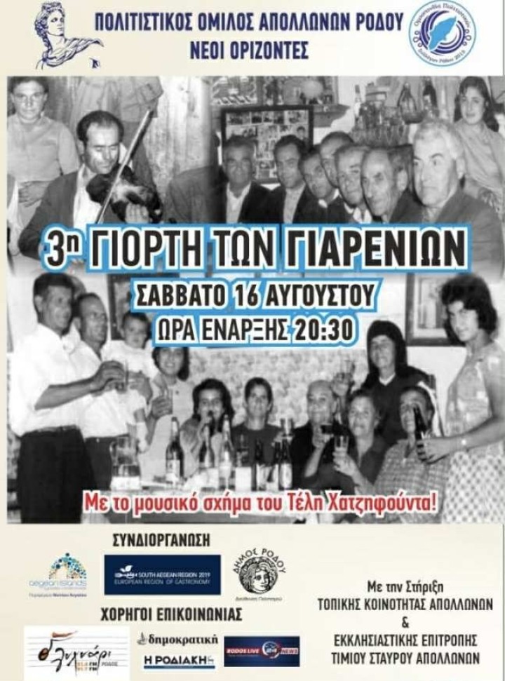 Ο Πολιτιστικός Όμιλος Απολλώνων Ρόδου «Νέοι Ορίζοντες» διοργανώνει την 3η Γιορτή των Γιαρένιων, αυτό το Σάββατο, 16 Αυγούστου 2025, στο προαύλιο Δημοτικού Σχολείου Απολλώνα, στις 20:30.