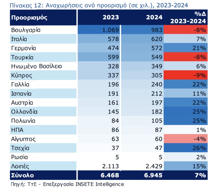 Περαιτέρω, με βάση τις αναχωρήσεις, το 2024 παρατηρείται μικρή αύξηση των μεριδίων των παραδοσιακών προορισμών υψηλής τουριστικής δαπάνης, όπως Γερμανία, Ηνωμένο Βασίλειο, Ιταλία, Γαλλία και Ολλανδία, από 27% το 2023 σε 28% το 2024, και μείωση των όμορων προορισμών χαμηλής τουριστικής δαπάνης, της Βουλγαρίας και της Τουρκίας, από 26% το 2023 σε 22% το 2024.