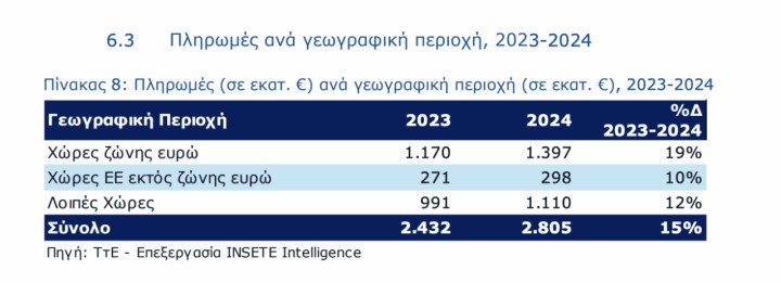 - Στην αλλαγή των ταξιδιωτικών προτιμήσεων των κατοίκων Ελλάδας από τους όμορους χαμηλής τουριστικής δαπάνης προορισμούς, δηλαδή την Τουρκία και τη Βουλγαρία (από 26% το 2023 σε 22% το 2024), στους παραδοσιακούς υψηλής τουριστικής δαπάνης προορισμούς, όπως η Γερμανία, η Γαλλία, η Ολλανδία και το Ηνωμένο Βασίλειο (από 27% το 2023 σε 28% το 2024), που έχουν συγκριτικά σημαντικά υψηλότερη δαπάνη.