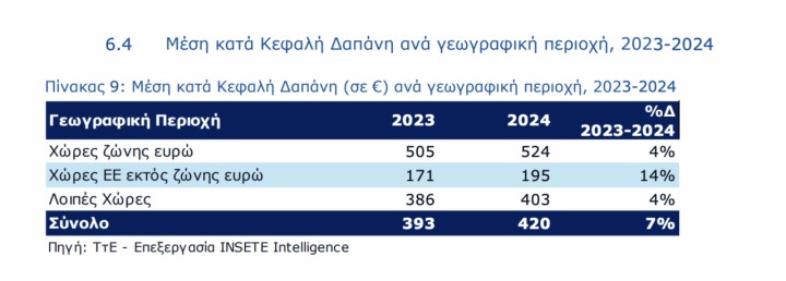 Η Μέση κατά Κεφαλή Δαπάνη (ΜΚΔ) ανήλθε στα 420 ευρώ το 2024, στο +7%, από τα 393 ευρώ του 2023, λόγω της αναλογικά υψηλότερης αύξησης που σημείωσε η Μέση Δαπάνη ανά Διανυκτέρευση (ΜΔΔ) κατά 17%, από τα 70 ευρώ το 2023 σε 81 ευρώ το 2024. Οι Έλληνες πάντως ξοδεύουν λιγότερα στο εξωτερικό σε σύγκριση με τα όσα ξοδεύουν οι ξένοι στην Ελλάδα, σε ποσοστό ενδεικτικά 27% για τη Μέση κατά Κεφαλή Δαπάνη.
