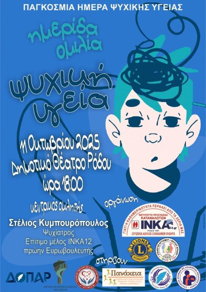 Με αφορμή την Παγκόσμια Ημέρα Ψυχικής Υγείας (10 Οκτωβρίου), η Επιτροπή Ψυχικής Υγείας ΙΝΚΑ12 διοργανώνει ομιλία–ημερίδα με θέμα την Ψυχική Υγεία. Η εκδήλωση θα πραγματοποιηθεί το Σάββατο 11 Οκτωβρίου 2025, στις 18:00, στο Δημοτικό Θέατρο και έχει ως στόχο την ενίσχυση της ενημέρωσης και της ευαισθητοποίησης γύρω από τα θέματα ψυχικής υγείας.