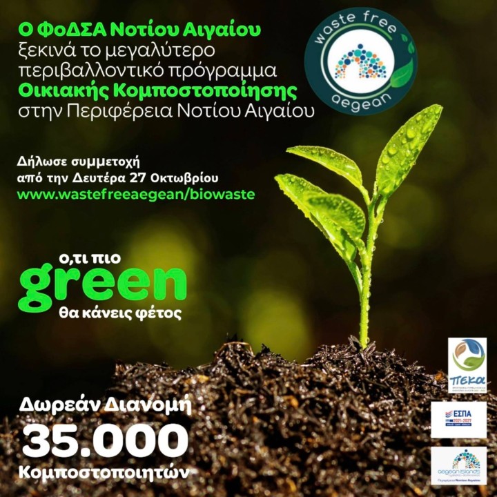 Η δράση, που συγχρηματοδοτείται από το ΕΣΠΑ 2021–2027 και το Ευρωπαϊκό Ταμείο Περιφερειακής Ανάπτυξης (ΕΤΠΑ), προβλέπει τη δωρεάν διάθεση 35.000 οικιακών κομποστοποιητών σε νοικοκυριά της περιφέρειας Νοτίου Αιγαίου.