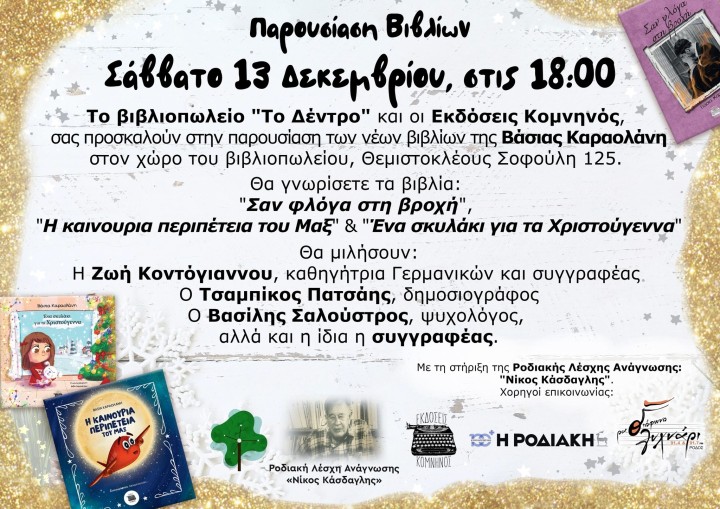 Το Σάββατο 13 Δεκεμβρίου και ώρα 18.00 θα πραγματοποιηθεί στο βιβλιοπωλείο «Το Δέντρο» στη Θεμιστοκλέους Σοφούλη 125 η παρουσίαση τριών βιβλίων της Βάσιας Καραολάνη από τις Εκδόσεις Κομνηνός.
