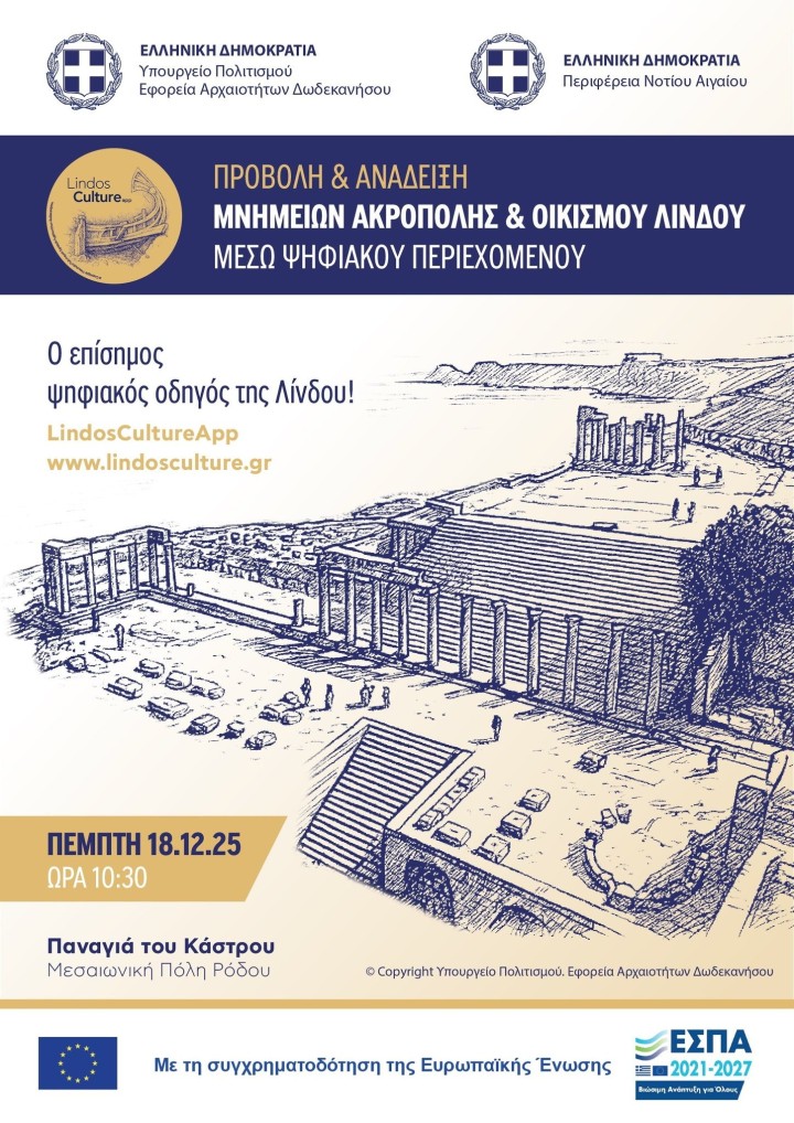 Η παρουσίαση του έργου με τίτλο «Προβολή και ανάδειξη μνημείων ακρόπολης και οικισμού Λίνδου μέσω ψηφιακού περιεχομένου» θα πραγματοποιηθεί την Πέμπτη 18 Δεκεμβρίου 2025 και ώρα 10:30, στον ιστορικό χώρο της Παναγίας του Κάστρου, στη Μεσαιωνική πόλη της Ρόδου. Πρόκειται για ένα έργο που φιλοδοξεί να προσφέρει στο κοινό μια νέα, σύγχρονη εμπειρία γνωριμίας με τα μνημεία της Λίνδου, συνδυάζοντας την ιστορική γνώση με τα ψηφιακά μέσα.