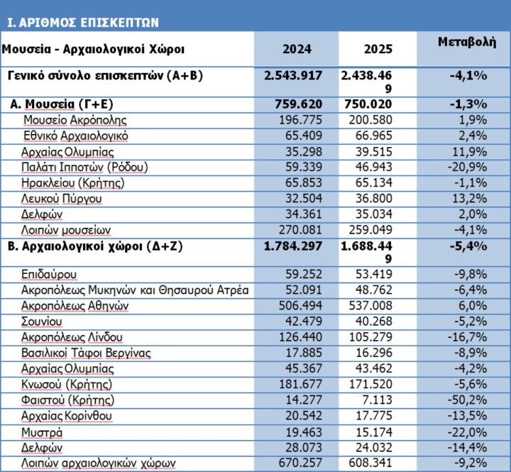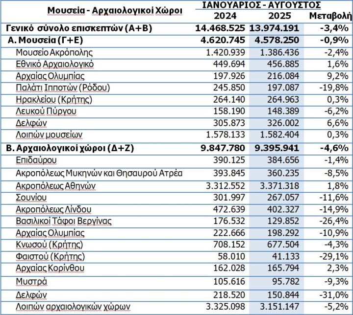 Σύμφωνα με τα στοιχεία που ανακοινώθηκαν από την ΕΛΣΤΑΤ, και τα δύο κατέγραψαν πτώση και μάλιστα σε διψήφιο ποσοστό, σε συνέχεια της πτωτικής πορείας και των προηγούμενων μηνών, εικόνα που παρατηρείται όμως στην πλειοψηφία των μουσείων και των αρχαιολογικών χώρων της χώρας.