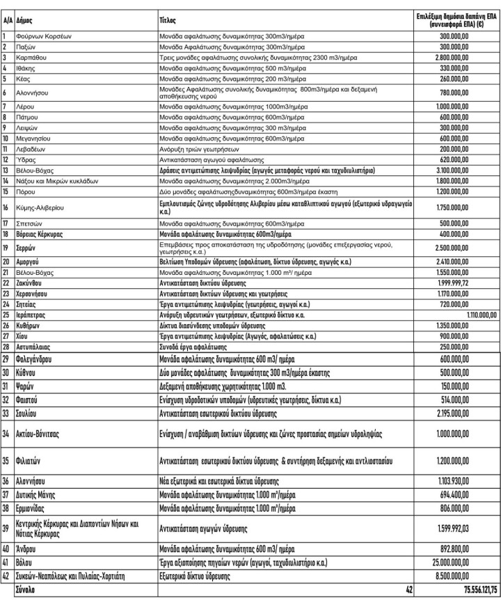 Το ποσό δεσμεύθηκε από το Τομεακό Πρόγραμμα Ανάπτυξης 2025 του Υπουργείου Περιβάλλοντος και Ενέργειας και αφορά, μεταξύ άλλων, στη δημιουργία και τον εκσυγχρονισμό μονάδων αφαλάτωσης, στη βελτίωση και αντικατάσταση δικτύων ύδρευσης, σε δράσεις αξιοποίησης πηγαίων νερών (αγωγοί, ταχυδιυλιστήρια) κ.ά.