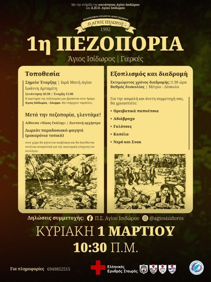 Ο Πολιτιστικός Σύλλογος Αγίου Ισιδώρου «Ο Άγιος Ισίδωρος» (1992), με τη στήριξη της Κοινότητας Αγίου Ισιδώρου και του Α.Π.Ο. Αγίου Ισιδώρου, διοργανώνει την 1η Πεζοπορία Άγιος Ισίδωρος – Γιερκές, προσκαλώντας μικρούς και μεγάλους φίλους της φύσης σε μια όμορφη διαδρομή στο τοπίο της περιοχής.