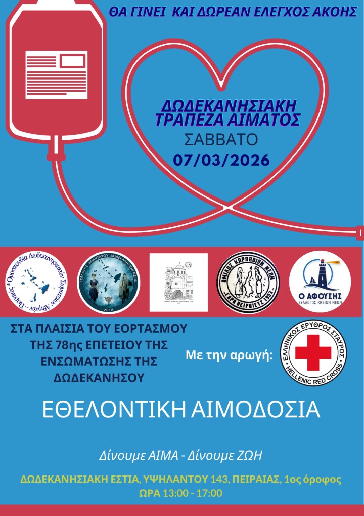 Η Ομοσπονδία Δωδεκανησιακών Σωματείων Αθηνών – Πειραιώς διοργανώνει εθελοντική αιμοδοσία το Σάββατο 7 Μαρτίου, από τη 13:00 έως τις 17:00, στη Δωδεκανησιακή Εστία (Υψηλάντου 143), στέλνοντας ένα ηχηρό μήνυμα προσφοράς και αλληλεγγύης.