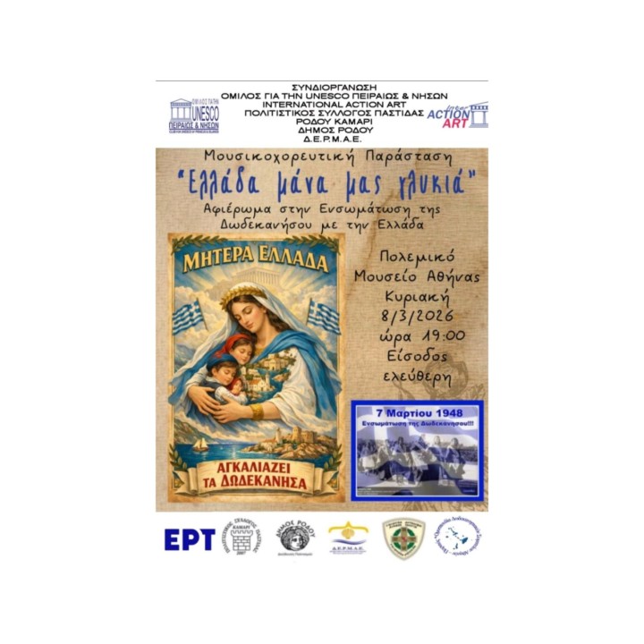 Μια ξεχωριστή πολιτιστική στιγμή θα πραγματοποιηθεί την Κυριακή 8 Μαρτίου 2026, καθώς ο ιστορικός Σύλλογος, υπό την καθοδήγηση του προέδρου του κ. Ιωσήφ Σιαλούπ, θα παρουσιάσει στο εμβληματικό σκηνικό του Πολεμικού Μουσείου Αθηνών την ολοκληρωμένη μουσικοχορευτική παράσταση, με τίτλο «ΕΛΛΑΔΑ ΜΑΝΑ ΜΑΣ ΓΛΥΚΙΑ».