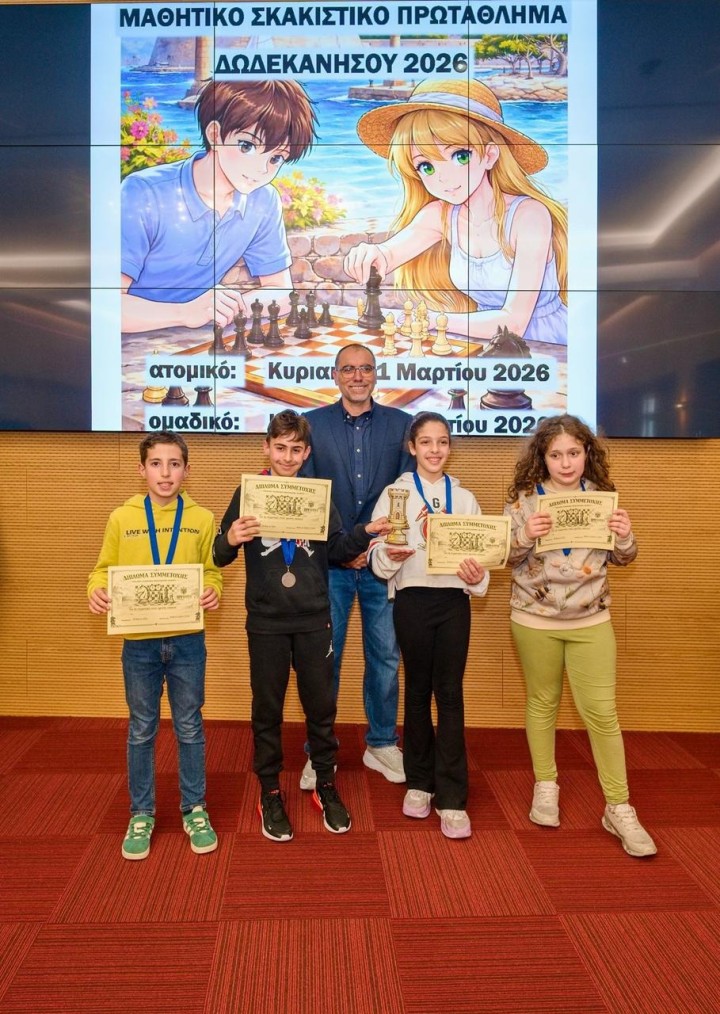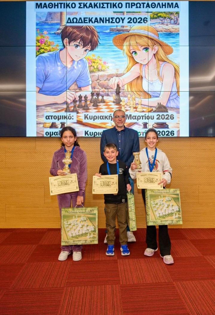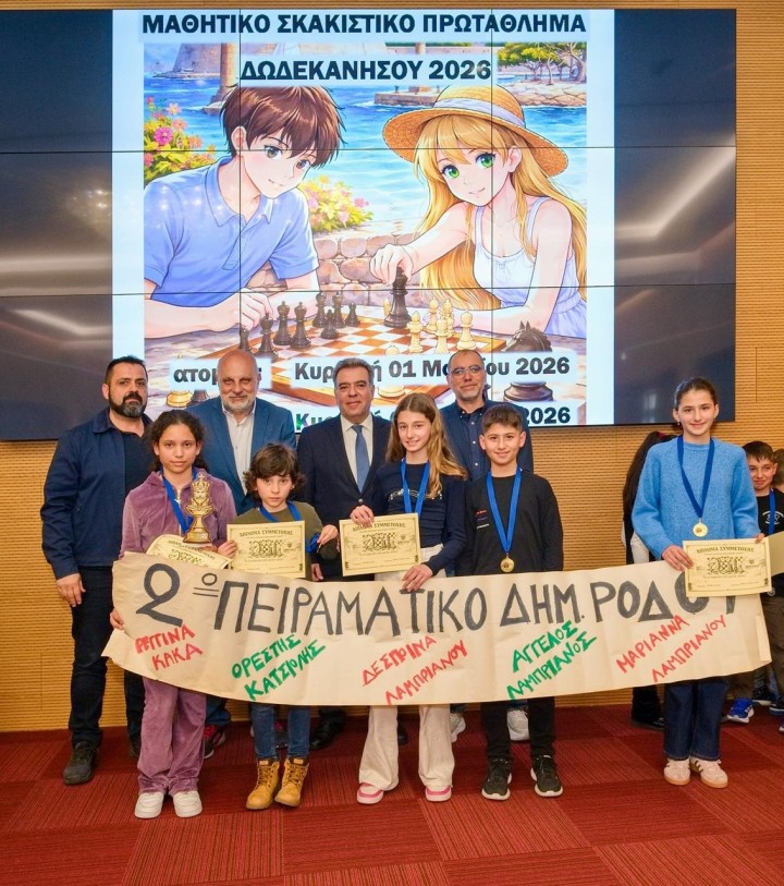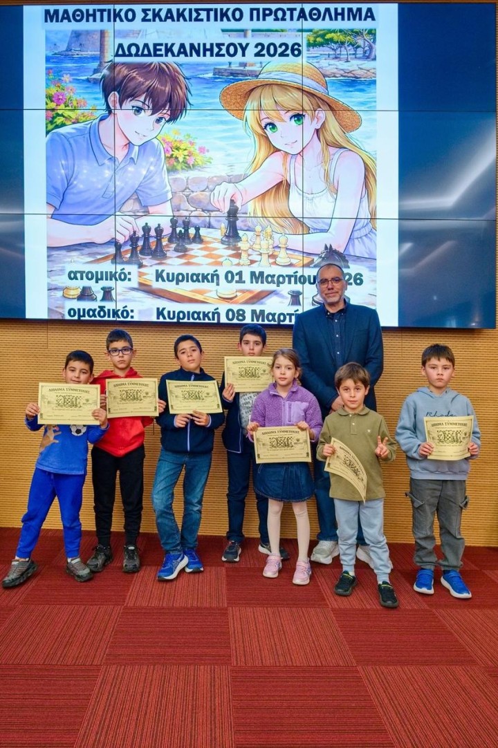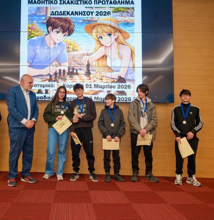 Ολοκληρώθηκε το Ομαδικό Μαθητικό Πρωτάθλημα Σκάκι Δωδεκανήσου 2026 την Κυριακή 8 Μαρτίου στην αίθουσα του ξενοδοχείου Acandia σε πέντε γύρους με ελβετικό σύστημα κληρώσεων και χρόνο σκέψης 15 λεπτά συν 10 δεύτερα πρόσθετο χρόνο μετά από κάθε κίνηση για τα Δημοτικά σχολεία και με κυκλικό σύστημα για τα Γυμνάσια Λύκεια. Οι αγώνες ξεκίνησαν το πρωί στις 09:30 και έληξαν στις 14:30, οπότε και έγιναν οι απονομές και τα αναμνηστικά διπλώματα για όλα τα παιδιά.