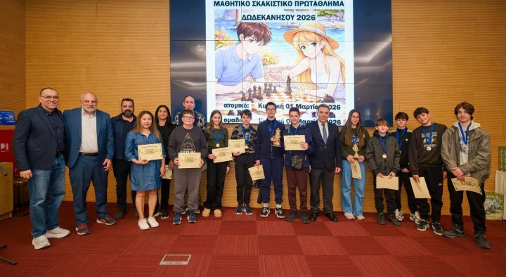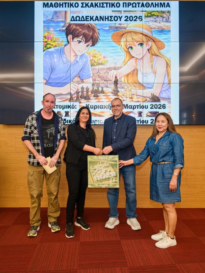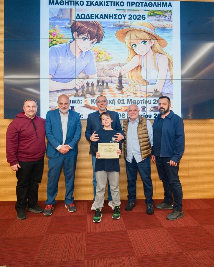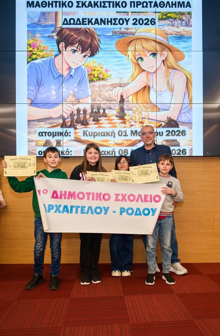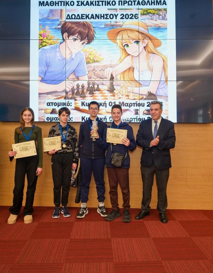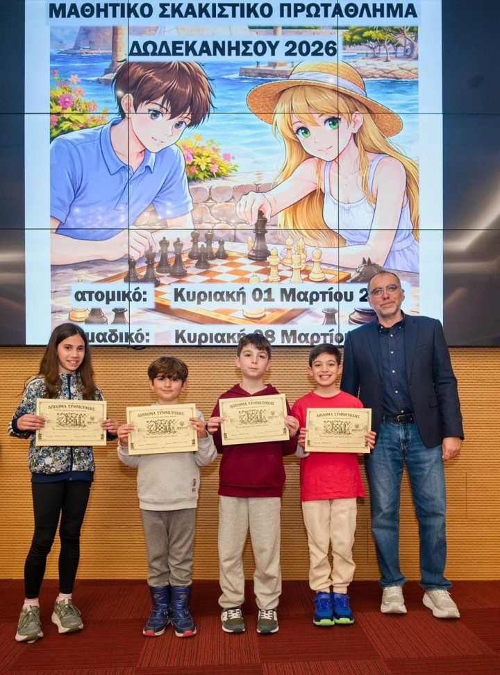 Ολοκληρώθηκε το Ομαδικό Μαθητικό Πρωτάθλημα Σκάκι Δωδεκανήσου 2026 την Κυριακή 8 Μαρτίου στην αίθουσα του ξενοδοχείου Acandia σε πέντε γύρους με ελβετικό σύστημα κληρώσεων και χρόνο σκέψης 15 λεπτά συν 10 δεύτερα πρόσθετο χρόνο μετά από κάθε κίνηση για τα Δημοτικά σχολεία και με κυκλικό σύστημα για τα Γυμνάσια Λύκεια. Οι αγώνες ξεκίνησαν το πρωί στις 09:30 και έληξαν στις 14:30, οπότε και έγιναν οι απονομές και τα αναμνηστικά διπλώματα για όλα τα παιδιά.