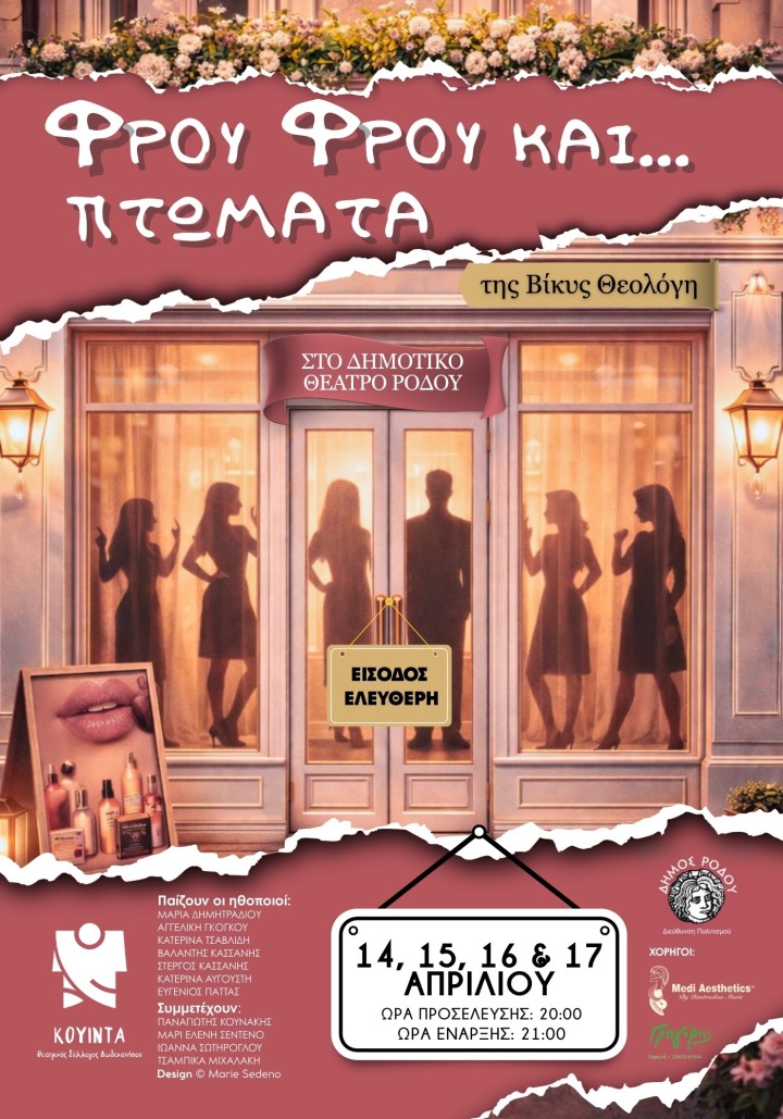 Η Διεύθυνση Πολιτισμού Δήμου Ρόδου σε συνδιοργάνωση με τον Θεατρικό Σύλλογο Δωδεκανήσου παρουσιάζει την θεατρική παράσταση «ΦΡΟΥ ΦΡΟΥ ΚΑΙ… ΠΤΩΜΑΤΑ» σε κείμενο και σκηνοθεσία της Βίκυς Θεολόγη. Μια καυστική φαρσοκωμωδία καταστάσεων, όπου το γέλιο ακουμπά τις πενήντα αποχρώσεις του γκρι (σχεδόν μαύρου) χιούμορ!Ένα φαινομενικά αθώο σαλόνι ομορφιάς μετατρέπεται σε πεδίο παρεξηγήσεων, μυστικών και… επικίνδυνων αποκαλύψεων.