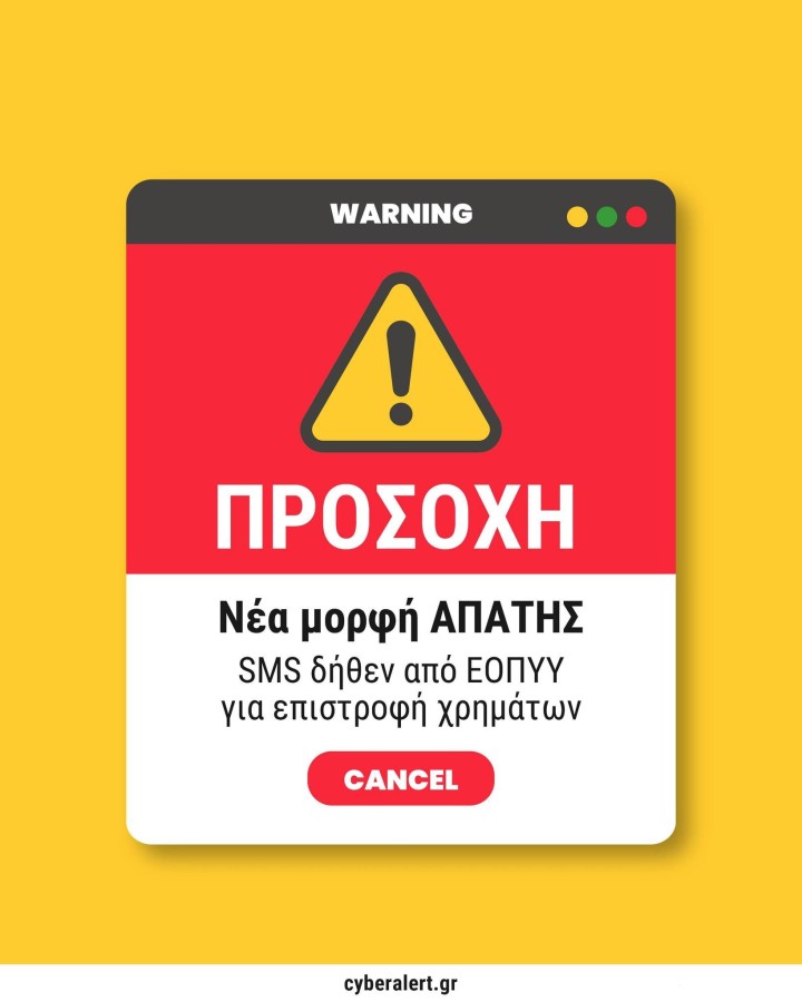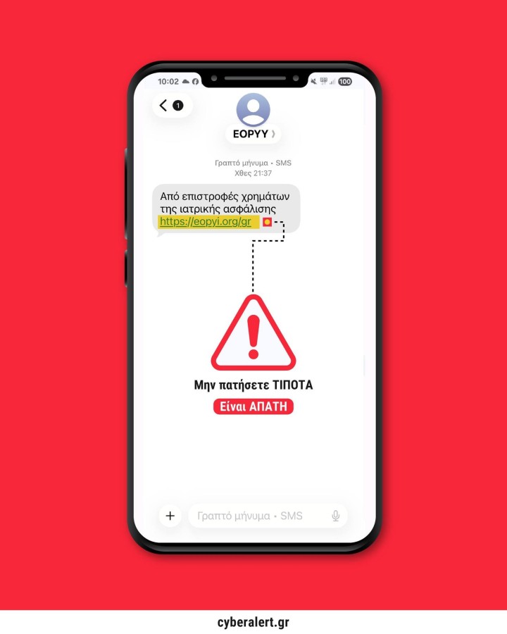 Υπενθυμίζεται ότι ο ΕΟΠΥΥ δεν αποστέλλει SMS με συνδέσμους για επιστροφές χρημάτων ή καταχώρηση στοιχείων.