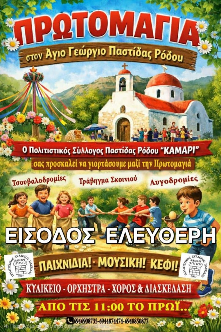 Παστίδα, Ρόδος – Σε έναν από τους πιο όμορφους ανοιξιάτικους θεσμούς του χωριού, ο Πολιτιστικός Σύλλογος Παστίδας «ΚΑΜΑΡΙ» καλεί μικρούς και μεγάλους να γιορτάσουν την Πρωτομαγιά την Παρασκευή 1η Μαΐου 2026, στο παρεκκλήσι του Άη Γιώργη, σε μια ημέρα αφιερωμένη στη φύση, την παράδοση και την κοινή συμμετοχή.