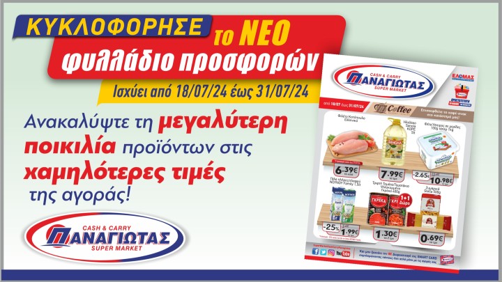 Επιχειρείν 18.07.2024 12:10 Ξεφυλλίστε On Line το ΝΕΟ ΦΥΛΛΑΔΙΟ των Super Market ΠΑΝΑΓΙΩΤΑΣ και νιώστε ένα κύμα δροσιάς και οικονομίας να σας κατακλύζει!