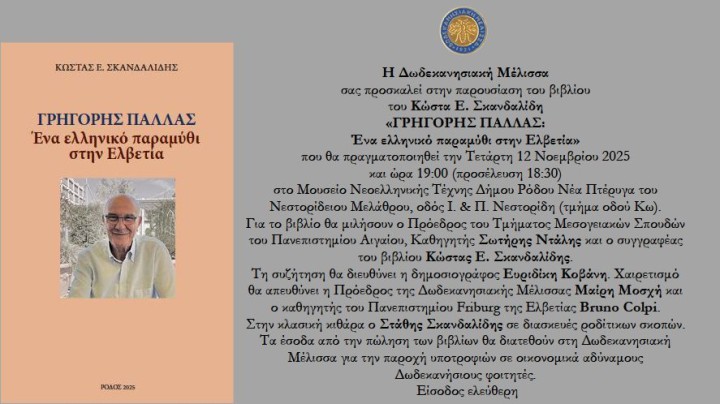 Πολιτισμός - Εκδηλώσεις 03.11.2025 11:00 Παρουσίαση του βιβλίου «Γρηγόρης Παλλάς: Ένα ελληνικό παραμύθι στην Ελβετία»-Τα έσοδα υπέρ των Δωδεκανησίων φοιτητών