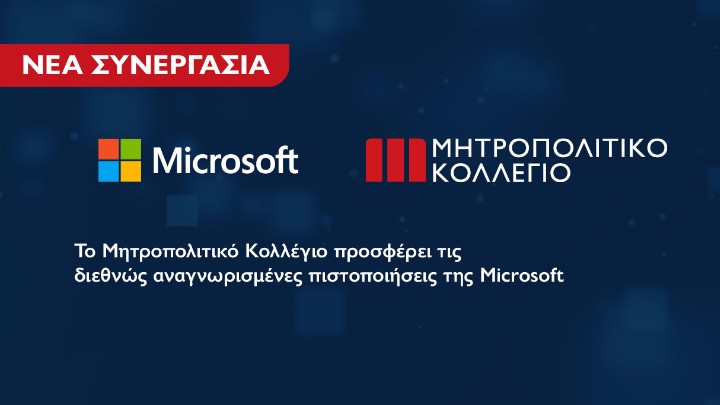 Παιδεία και Εκπαίδευση 11.03.2022 12:15 Το Μητροπολιτικό Κολλέγιο συνεργάζεται με τη Microsoft για την παροχή διεθνώς αναγνωρισμένων πιστοποιήσεων