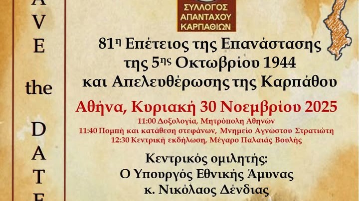 Επικαιρότητα 24.10.2025 17:15 Η Αθήνα τιμά την 81η Επέτειο της Επανάστασης και Απελευθέρωσης της Καρπάθου – Παρών ο Νίκος Δένδιας