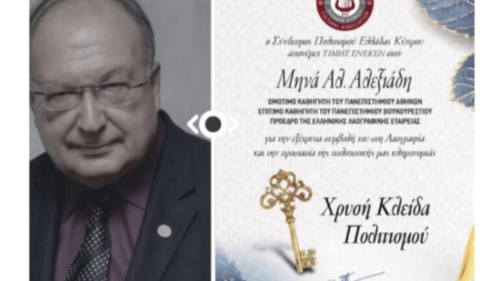 Επικαιρότητα 15.10.2025 17:30 «Χρυσή Κλείδα Πολιτισμού» στον συμπατριώτη μας Καθηγητή Μηνά Αλ. Αλεξιάδη