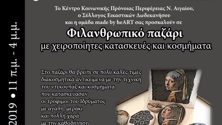 Πολιτισμός - Εκδηλώσεις 27.09.2019 21:30 Φιλανθρωπικό παζάρι χειροποίητων δημιουργιών στο Ίδρυμα Κολυμπίων